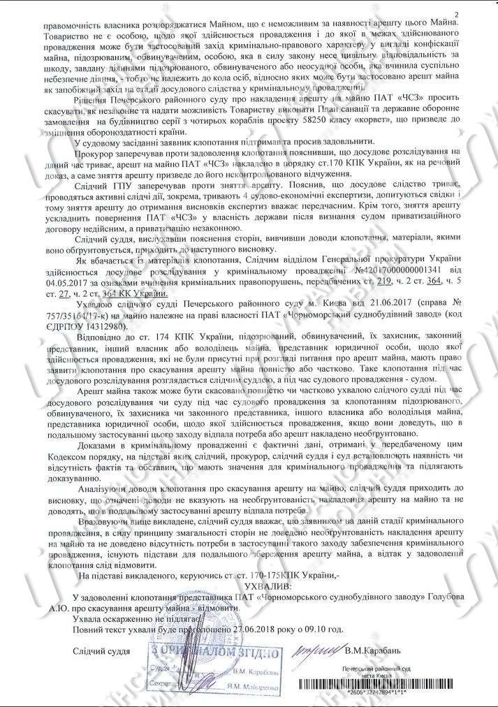 Печерский районный суд Киева отказал Публичному акционерному обществу (ПАО) "Черноморский судостроительный завод" (ЧСЗ) в удовлетворении ходатайства о снятии ареста с имущества завода, наложенного по инициативе Генеральной прокуратуры Украины еще год назад.