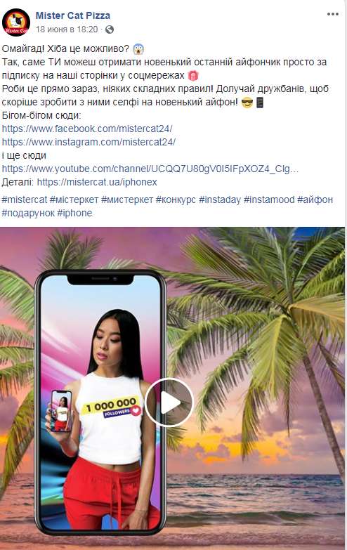 В Киеве пиццерия Mister Cat Pizza объявила розыгрыш iPhone X за подписку в социальных сетях Facebook и Intagram.
