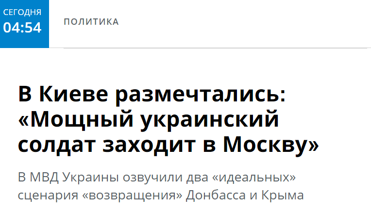 "Для украинцев существует только два идеальных сценарии развития событий на Донбассе. Первый - Россия добровольно отдает Крым, Донбасс, компенсирует все материальные убытки. Второй - мощный украинский солдат заходит в Москву. Понятно, что подобные сценарии желательны, но мы четко понимаем, что на вещи надо смотреть реально, и такие блестящие сценарии оторваны от жизни", - сказал он.