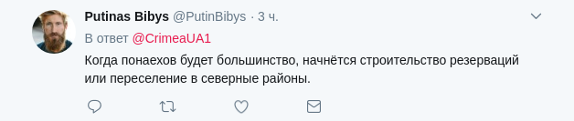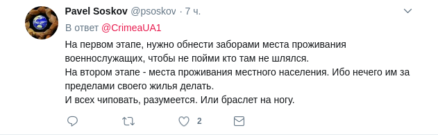 "Когда понаехов будет большинство, начнётся строительство резерваций или переселение в северные районы", "Представляете, как потом всех этих барнаульских, благовещенских и мухосранских трудно будет вышвыривать из нашего украинского Крыма? Под вопли европейских толерастов", "На первом этапе, нужно обнести заборами места проживания военнослужащих, чтобы не пойми кто там не шлялся. На втором этапе - места проживания местного населения", - пишут они.