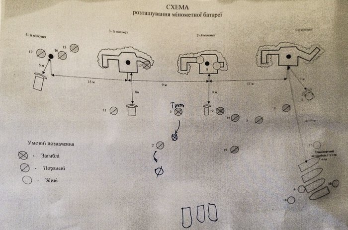 В нашем распоряжении оказалась схема расположения минометной батареи, которую использует следствие. От руки очевидцы исправили неточности.