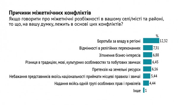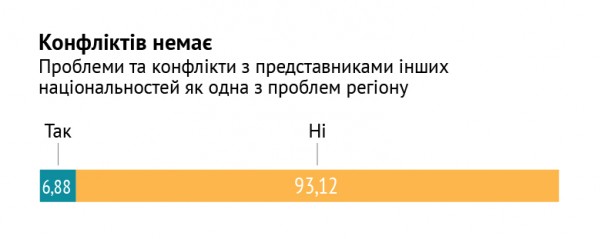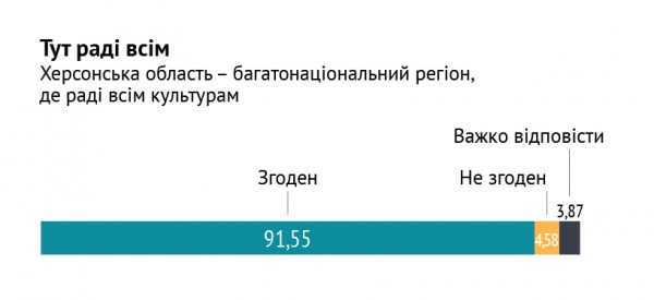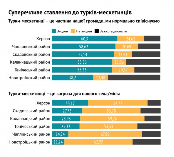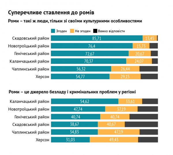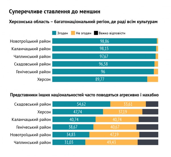 Каждый пятый опрошенный (всюду, за исключением Херсона) считает, что турки-месхетинцы является угрозой для региона. О ромах так думает каждый второй. При этом, половина респондентов согласна с утверждением, что месхетинцы является частью их общины, и им удается нормально сосуществовать. 73 процента опрошенных называют ромов такими же людьми, как и все, только с культурными особенностями. Такие мысли сосуществуют с мнением об угрозе от меньшинств.