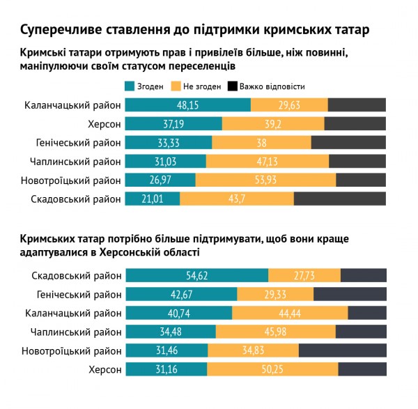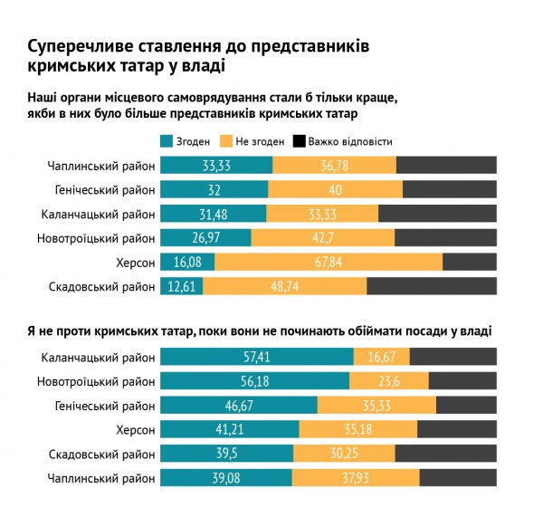 В отношении крымских татар: каждый третий опрошенный считает, что стало бы только лучше, если бы в органах местного самоуправления их было больше. При этом, треть респондентов разделяет мнение, что они получают больше привилегий, манипулируя статусом вынужденных переселенцев. И почти половина опрошенных считает, что крымских татар надо больше поддерживать, чтобы они лучше адаптировались.