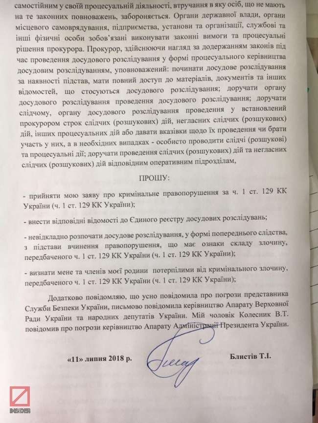 "В нашей семьи есть реальные основания опасаться осуществления этой угрозы как самим Пашинским, так и другими лицами, поскольку Пашинский С.В. мне сказал, что я еще не знаю, кто он такой и что у него для таких, как я, есть "специально обученные люди". Кроме того, Пашинский С.В. сообщил мне, что он является очень богатым человеком, а именно, что его состояние составляет 10% ВВП Украины, а я никто в этом мире", – написала Блистив.