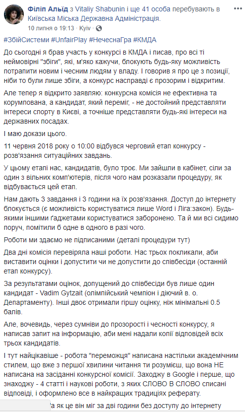 Как сообщает Филипп Альид, принимавший участие в конкурсе на замещение должности руководителя Департамента молодежи и спорта КГГА, конкурсантам дали 3 задания и 3 часа на их решение. Пользоваться какими-либо гаджетами было запрещено, конкурсанты имели доступ только к порталу Лига.Закон и Word.
