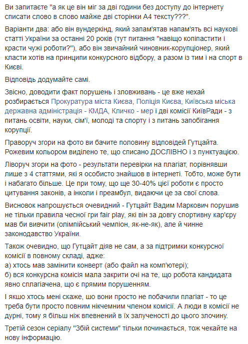 “Как в КГГА проводят конкурсы на замещение должностей? Победитель конкурса на должность руководителя Департамента спорта Вадим Гутцайт написал работу, которая слизана на 30-40% из интернета”, - сказано в сообщении.
