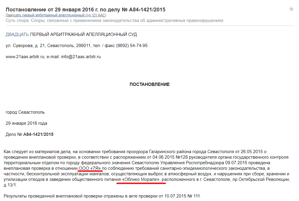 А відповідно до постанови окупаційного севастопольського “Двадцять первого арбитражного апелляционного суда” від 29 січня 2016 року, справа № А84-1421/2015, на компанію «ООО «7я» накладено штраф щодо недотримання вимог санітарно-епідеміологічного законодавства в закладі громадського харчування «Облико Морале», розташованого в м. Севастополі, Пр. Жовтневої Революції, буд.13 / 1. Це може говорити про те, що ресторан «Облико Морале» належить до «ООО «7я». (додаток 3)