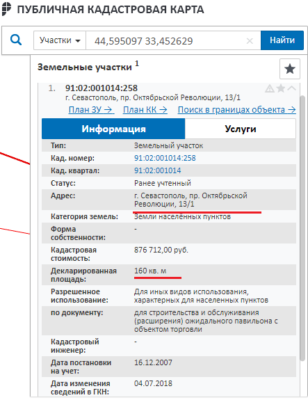 У свою чергу, відповідно до публічної кадастрової карти РФ, за адресою м. Севастополі, Пр. Жовтневої Революції, буд.13 / 1, дійсно розташована будівля площею 160 м2.
