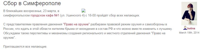 В период аннексии Крыма в начале 2014 года Бутина уже открыто активно участвует в становлении «власти» на оккупационной территории и переманивает владельцев оружияна сторону России.
