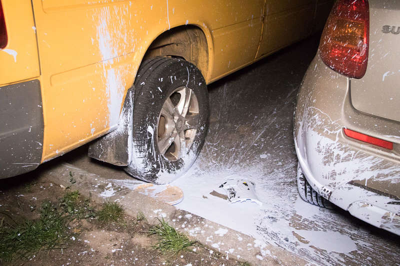 Все началось с того, что местные жители услышали крики о помощи примерно с 15 этажа, а после этого с верхних балконов дома полетели ведра с краской, которые испачкали четыре припаркованных автомобиля.