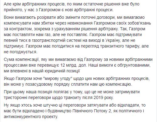 "Как мы сказали "Газпрому" на трехсторонней встрече, мировое соглашение по уже принятым арбитражем решениям невозможно. Это даже противоречит сути мировых соглашений - нужно было о них договариваться до принятия окончательного решения арбитражем. А сейчас уже поздно просить "мировое соглашение" по этим спорам. "Газпром" должен заплатить нам по решениям арбитража 2,56 млрд долларов, плюс уже 75 млн долларов процентов, а также компенсировать расходы на принудительное взыскание", - написал он.