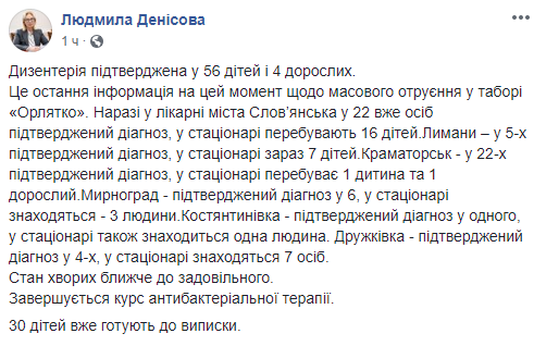 "Это последняя информация на данный момент о массовом отравлении в лагере "Орленок". Сейчас в больнице города Славянска в 22 человек подтвержден диагноз, в стационаре находятся 16 дитей. Лиманы - у 5-х подтвержден диагноз, в стационаре сейчас 7 детей. Краматорск - у 22-х подтвержден диагноз, в стационаре находится 1 ребенок и 1 взрослый. Мирноград - подтвержденный диагноз у 6, в стационаре находятся - 3 человека. Костянтинивка - подтвержден диагноз у одного, в стационаре также находится один человек. Дружковка - подтвержден диагноз у 4-х, в стационаре находятся 7 человек", - сказано в сообщении.