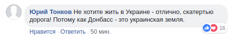"Не хотите жить в Украине - отлично, скатертью дорога! Потому как Донбасс - это украинская земля", "Господи, из-за таких тупиц сколько народу погибло и потеряло нормальную жизнь. Нет им прощения, всех в Сибирь", "Забирай свои манатки и вали", - пишут комментаторы.