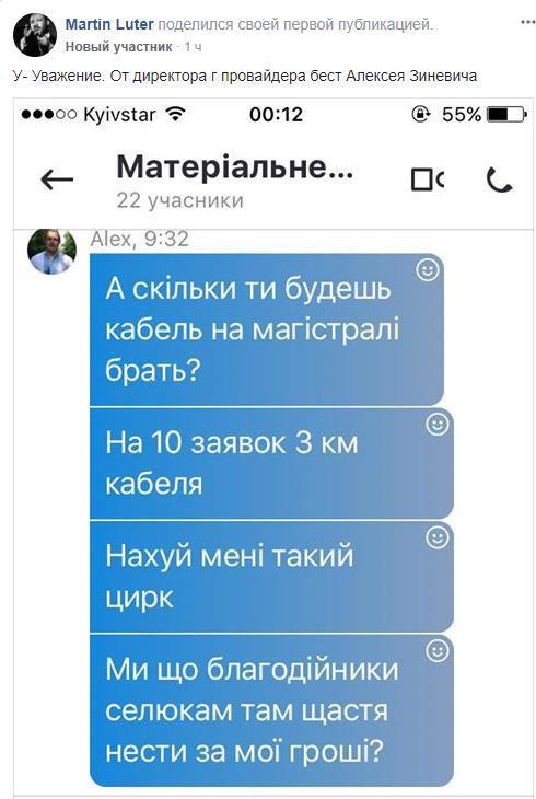 Реальне ставлення Зіневича до свого бізнесу і до людей яскраво характеризує переписка, яку виставив в інтернет один із користувачів Facebook. В ній Олексій Зіневич (Алекс Бест) нецензурно висловлюється щодо необхідності придбати необхідну за нормативами довжину кабеля для підключення споживачів, називаючи їх “селюками”, і відмовляється це робити, мотивуючи свої дії тим, що він не благодійник: «ми що благодійники щастя селюкам там нести за мої гроші», – пише він.