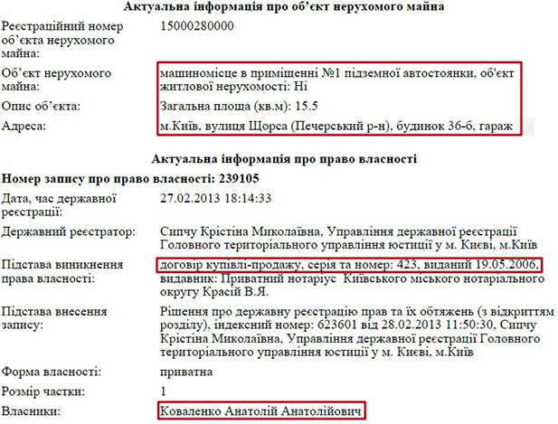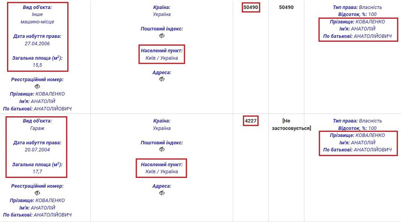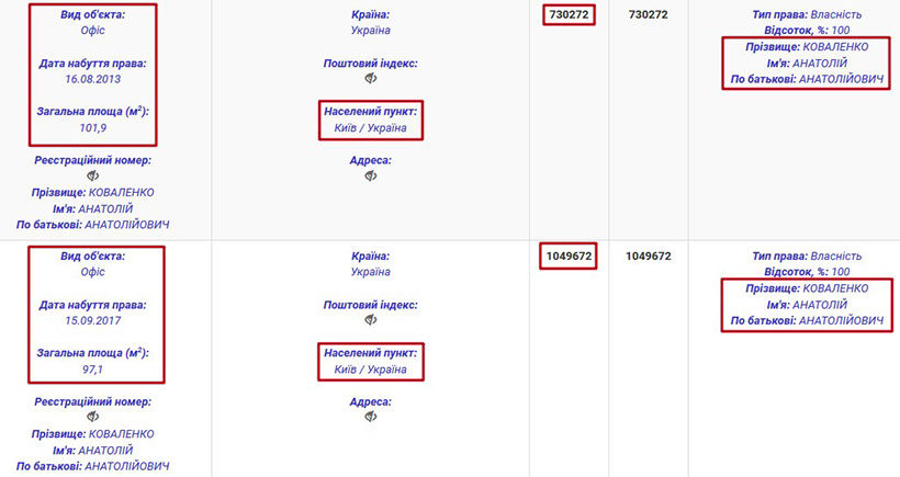 Окрім того, Анатолій Коваленко є власником квартири в Києві, що розташована за адресою: вул. Євгена Коновальця (раніше вул. Щорса), 36б. Вказана вартість квартири – 775 тис. грн. Також Анатолій Анатолійович є власником двох гаражів, один з яких розміщений у цьому ж будинку.