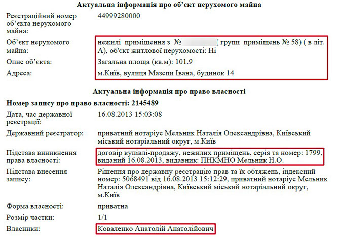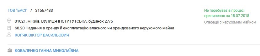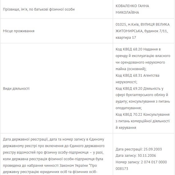 Ганна Миколаївна Коваленко зареєстрована фізичною особою-підприємцем і власником товариства з обмеженою відповідальністю «БАСІ». Увесь бізнес пані Ганни пов’язаний з операціями з нерухомим майном.
