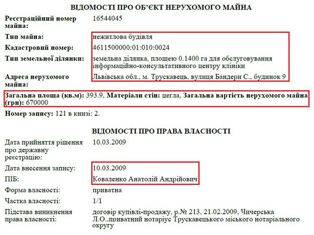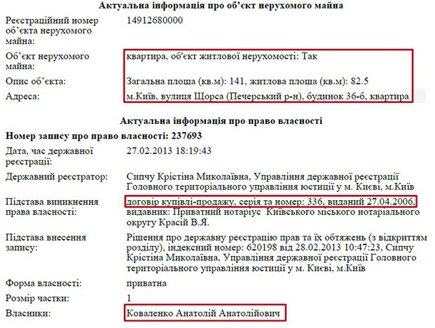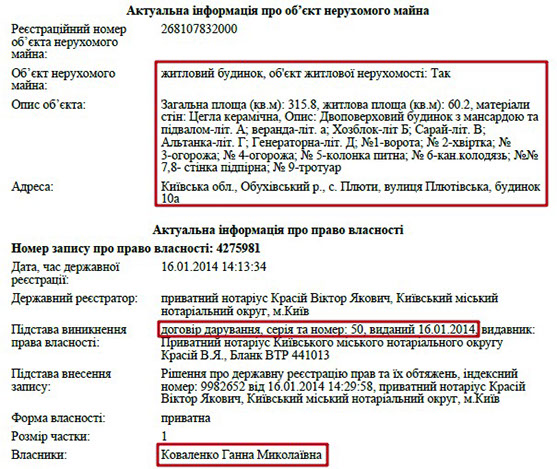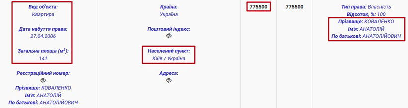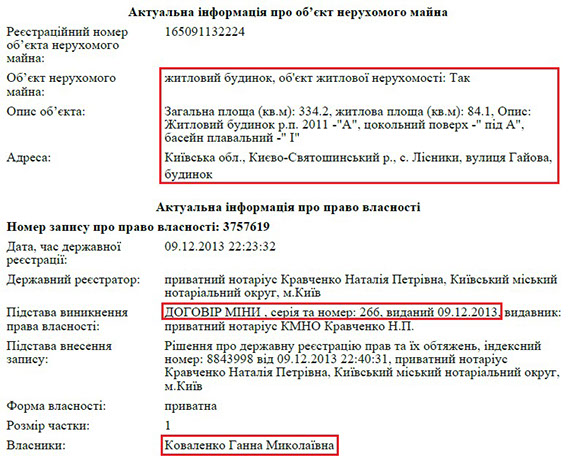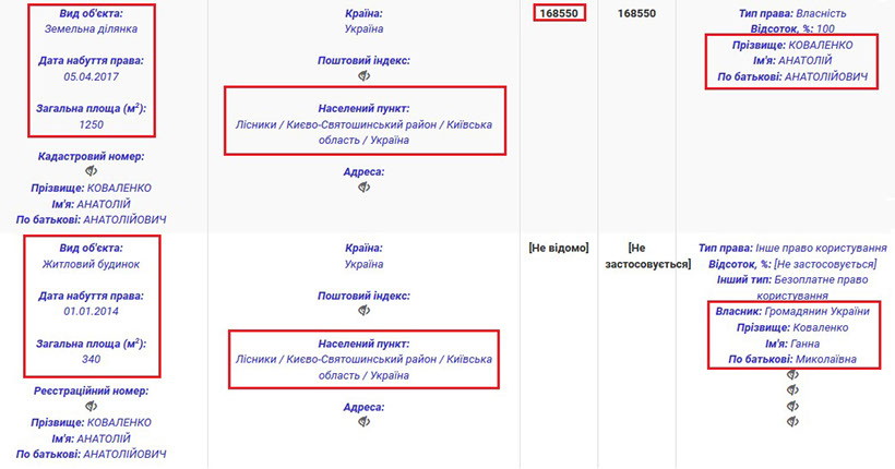 Анатолій Анатолійович проживає та користується будинком, власником якого є його матір Ганна Миколаївна. Ганна Миколаївна є власником і земельної ділянки під цим маєтком, однак нею Анатолій Коваленко не має права користуватися. Загалом же, будинок площею 340 кв. м. був набутий пані Ганною на підставі договору міни 2013 року та розташований в елітному с. Лісники, що неподалік Києва. Анатолій Анатолійович теж має земельну ділянку в Лісниках, яка обійшлася йому в 168 тис. грн.