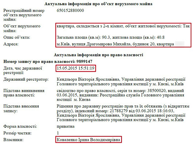 У дружини члена КДКП пані Ірини у власності перебуває квартира в Києві площею 90 кв. м. за адресою: вул. Михайла Драгомирова, 20. Подібне житло сьогодні коштує бл. 245 тис. дол.