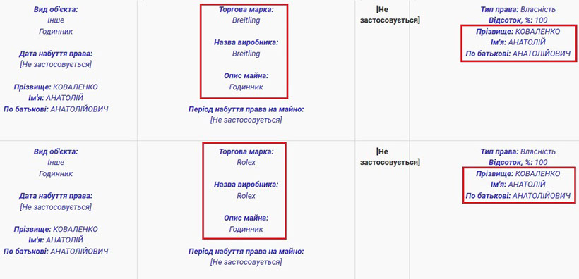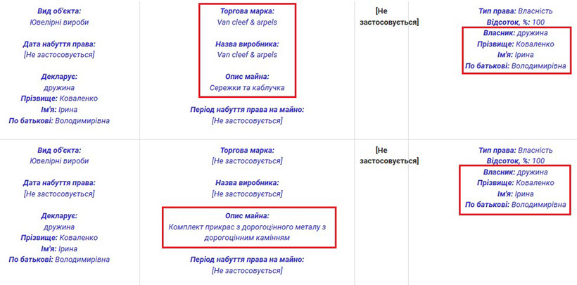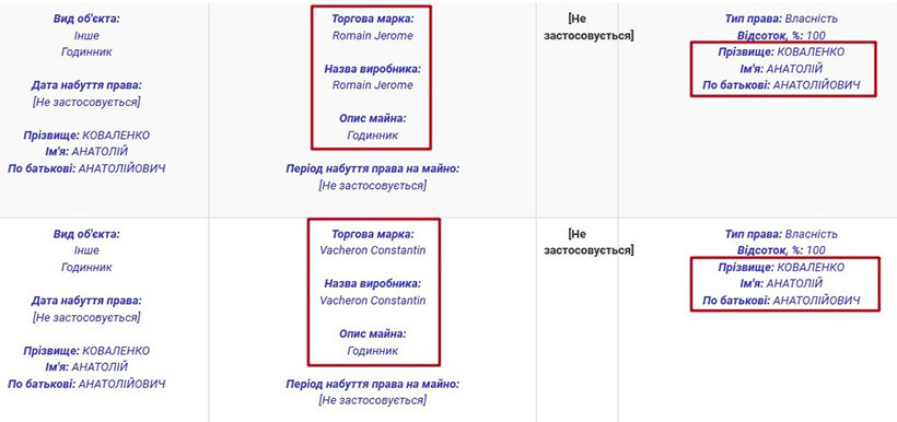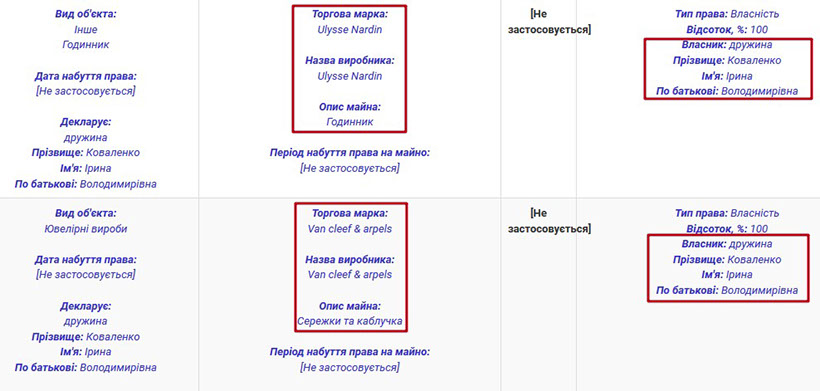 У власності подружжя Коваленків також досить багато дорогих аксесуарів. Зокрема, Анатолій Анатолійович володіє годинниками марок Romain Jerome, Vacheron Constantin, Breitling та Rolex. Ірина Володимирівна теж має годинник від Ulysse Nardin та ювелірні вироби від Van cleef & arpels. Також пані Ірина задекларувала комплект прикрас із дорогоцінного металу з коштовним камінням.