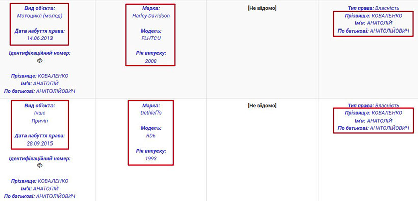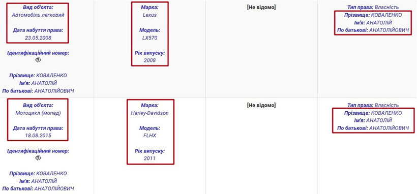 Не менш розкішні в подружжя й автомобілі. Зокрема, Анатолій Анатолійович є власником Lexus LX570 2008 року, придбаного у тому ж році. Навіть сьогодні таке авто коштує бл. 45 тис. дол. Також Анатолій Коваленко задекларував два мотоцикли Harley-Davidson FLHX 2011 року та FLHTCU 2008 року. Крім того, у декларації згадуються причіп і вантажний автомобіль
