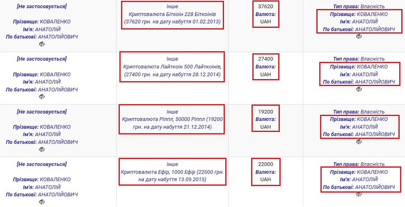 У декларації Анатолія Анатолійовича також вказано досить великі заощадження. Ми підрахували, що в пана Анатолія є 5,7 млн грн, 255 тис. дол. та 27 тис. євро. В Ірини Володимирівни у власності 858 тис. грн та 28 тис. дол. Окрім того, Анатолій Анатолійович придбав криптовалют на суму понад 100 тис. грн.