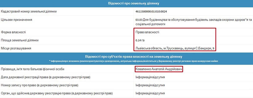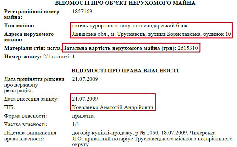 Батько Анатолія Анатолійовича значиться власником нежитлового приміщення в Трускавці за адресою вул. Бандери, 9 та готелю «Сенатор» на вул. Бориславська, 10. Втім, якщо поглянути на першу будівлю на карті, то вона більше схожа на приватний будинок.