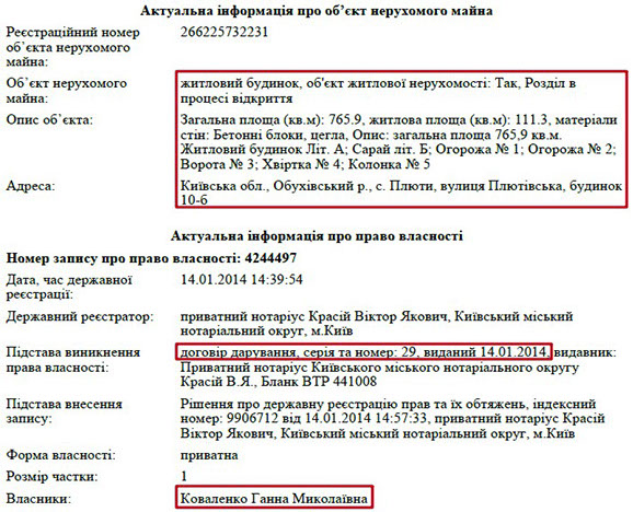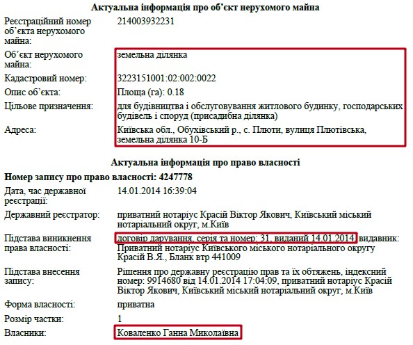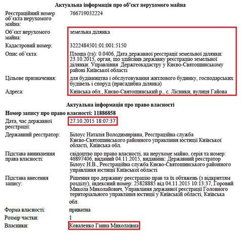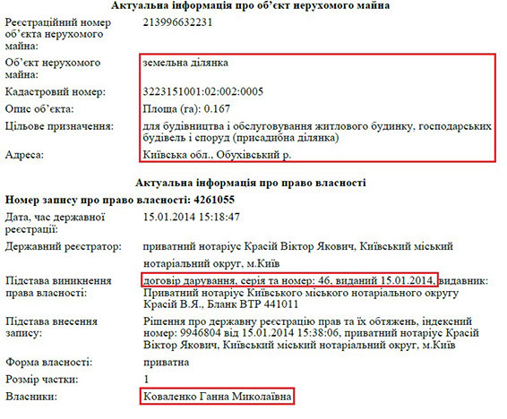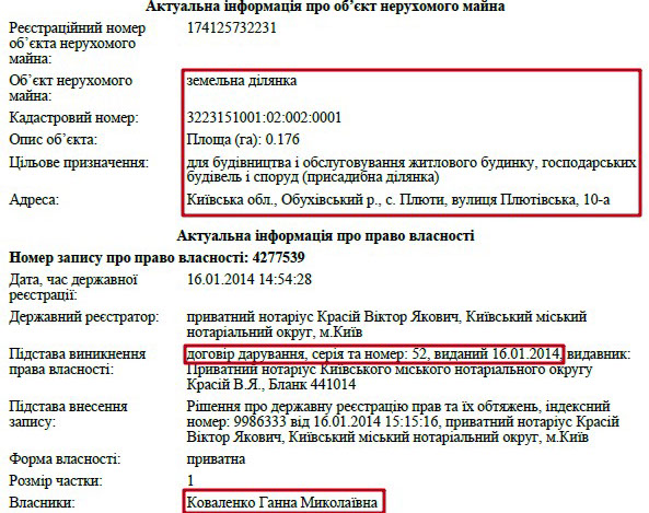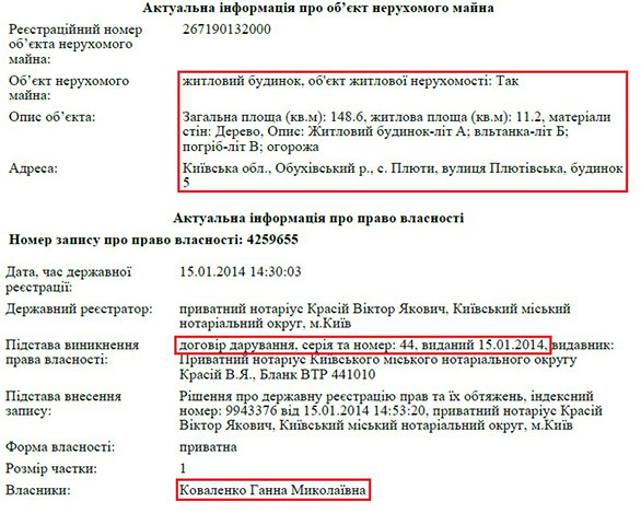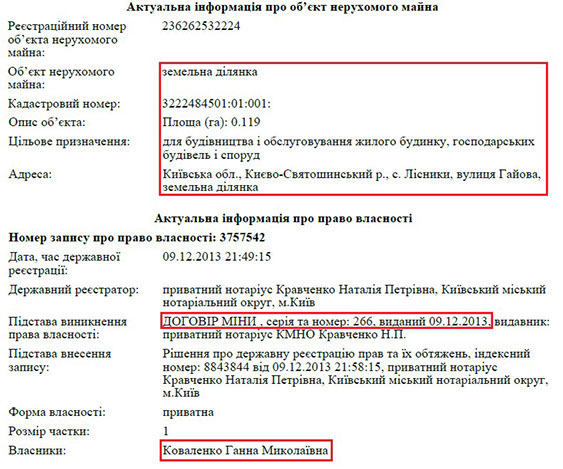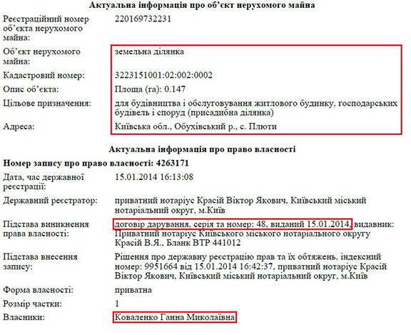 Та ще більше нерухомого майна в матері члена КДКП. Зокрема, у її власності цілий комплекс маєтків у с. Плюти, що біля Києва. Йдеться про 3 будинки загальною площею 1228 кв. м. Також пані Ганна володіє ще однією ділянкою в Лісниках.