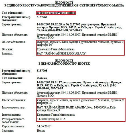 Окрім того, у Реєстрі речових прав на нерухоме майно згадується квартира на вул. Грушевського, 9. Її власником теж є Ганна Миколаївна, і ця квартира, схоже, є в заставі під кредит розміром 1,47 млн дол. Також нам вдалося дізнатися, що пані Ганна є власником автомобіля Range Rover 2007 року.