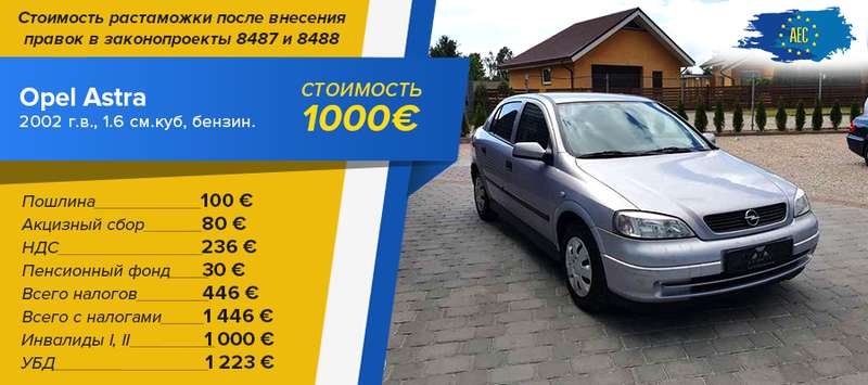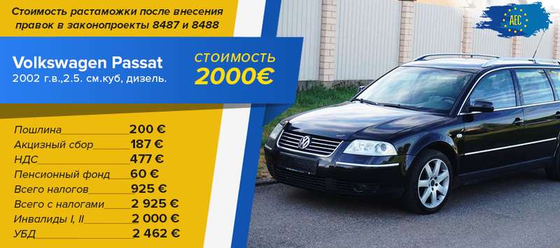 На примере VW Passat 2002 год, стоимостью 2000 евро, двигатель 1.9 дизель: пошлина 10% — 2000 евро Х 0,1 = 200 евро., Акциз 75 евро Х 1.9 = 142.5 евро. Добавляем: пошлина + акциз 200 евро + 142.5 евро = 342.5 евро. Рассчитываем НДС (стоимость авто + пошлина + акциз) х 20% (2000 евро + 200 евро + 142.5 евро = 2342.5 евро) х 20% = 468.5 евро. Пенсионный фонд 3% от (пошлина + акциз + НДС) (200 евро + 142.5 евро + 468.5 евро = 811 евро) х 3% = 24.3 евро. В общем налогов: (пошлина + акциз + НДС + пенсионный фонд): (200 + 142.5 + 468.5 + 24.3 = 835.3 евро), то есть растаможка от 500 до 1000 евро, за доступные марки авто есть в пределах европейских налогов около 40% при импорте авто в Евросоюз например из США.