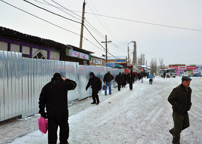 Очередной виток противостояния пришелся на январь 2014 года. Пока в Киеве бушевали известные события, торезский «Скиф-сервис» под шумок взял и просто отгородил от вокзала ряд спорных киосков сплошным металлическим забором, сделав торговлю невозможной. Причем, забор установил прямо на тротуаре, который вообще не является территорией рынка и относится к территории горсовета, создав для прохожих неудобное препятствие.
