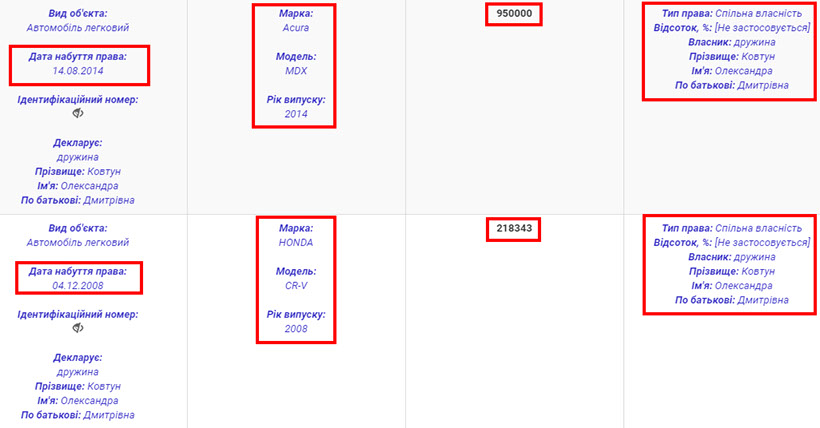 Попри наявність машиномісць, задекларований парк транспортних засобів виявився скромнішим. Так, у родині ніхто не користується автівками, крім дружини Олександри Ковтун. У її власності два авто HONDA CR-V, придбана 2008 року за 218 343 грн, та Acura MDX від 2014 року за 950 000 грн.