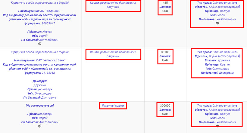 Станом на 2017 рік у банківських установах готівкою сім’я Ковтунів зберігає 62 466 євро, 346 072 гривень і 425 доларів заощаджень.