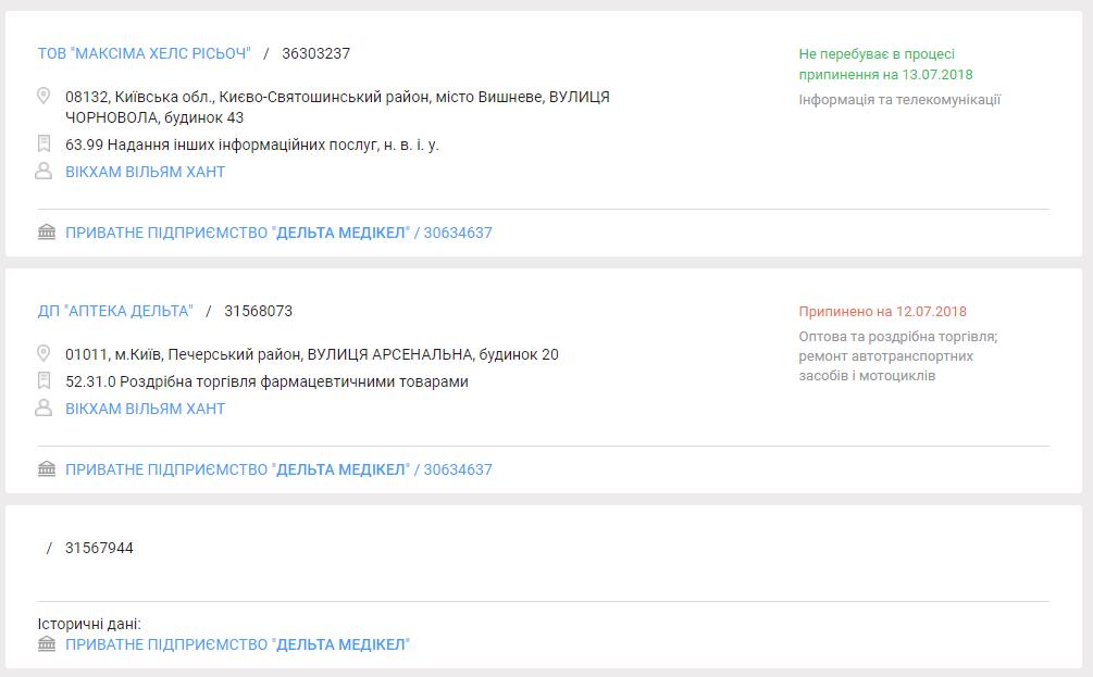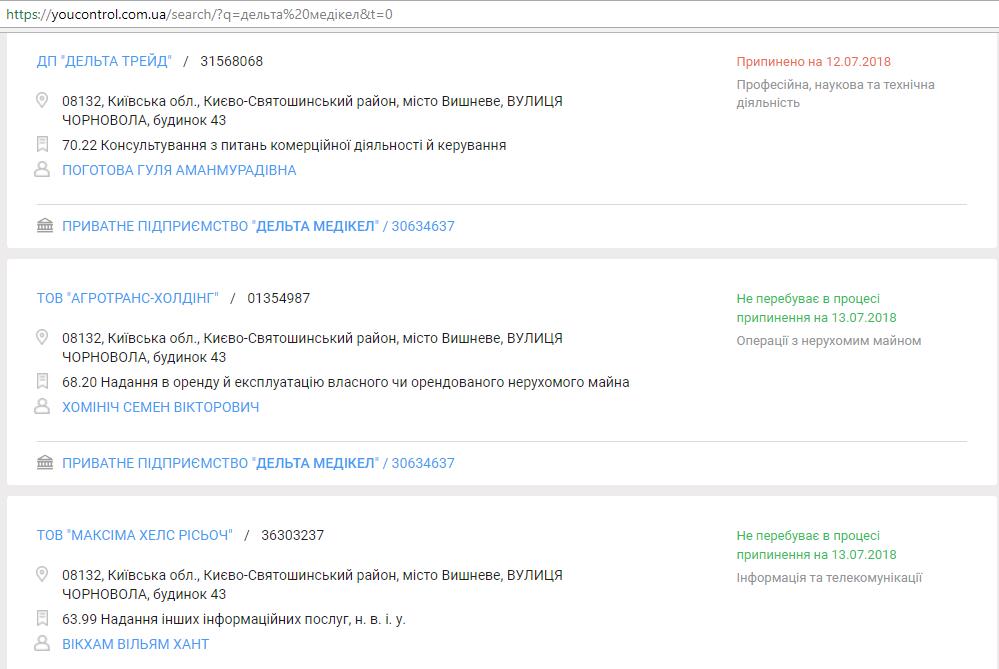 Нам удалось установить, что Светлана Таболина работала в ЧП «Дельта Мэдикэл» («Дельта Медікел» – в украинской версии). Сам по себе ЧП как ЧП, но YouControl связывает его с рядом других влиятельных структур. Например, ДП «Дельта Трейд», ООО «Агротранс-Холдинг», ООО «Максима Хелс Рисёч», ДП «Аптека Дельта» и др.