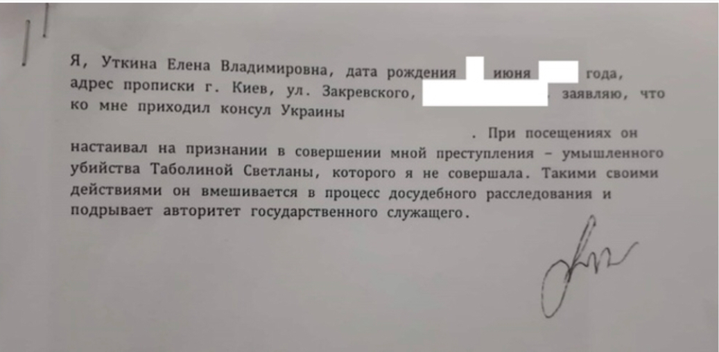 То, что следствие пошло (точнее, его повели за руку) по заведомо ложному следу, подтверждают и последние новости из Испании. Как на днях писали СМИ, Елена Уткина, содержащаяся в Пенитенциарном центре Мадрид VII (аналог украинского СИЗО), подверглась беспрецедентному давлению. Взять на себя вину, от Елены требовал лично украинский консул Владимир Грабовенко. Соответствующее заявление Елена написала сразу же, и оно содержится в материалах дела.