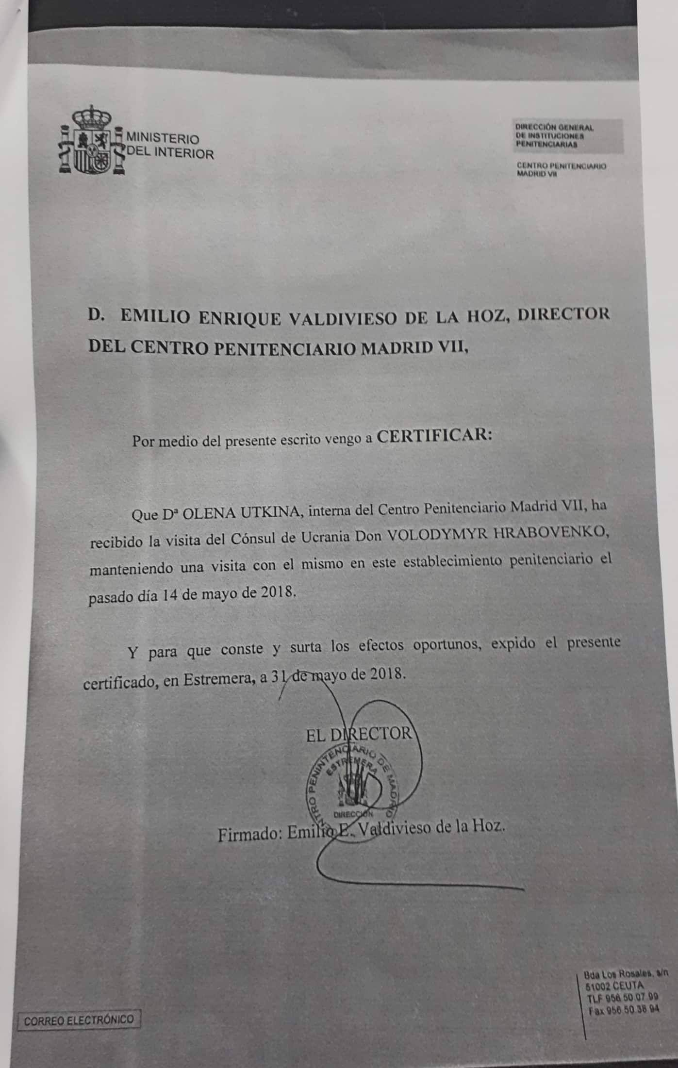 Обратите внимание, что в заявлении Уткиной не стоит ФИО консула – вероятно, женщина был взволнована пережитой встречей, и просто не запомнила, кто к ней приходил. О том, что Владимир Грабовенко проведывал Уткину в Пенитенциарном центре, нам подтвердили и в Министерстве внутренних дел Испании, лично директор Пенитенциарного центра Мадрид VII Дон Эмилио Энрике Вальдивьесо Де Ла Хоз.