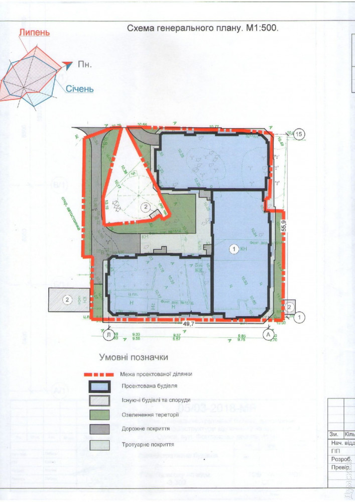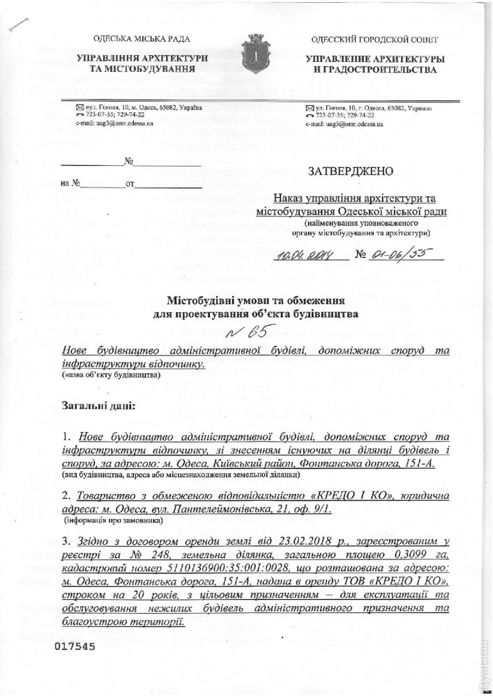 Градостроительные условия и ограничения на застройку участка площадью 0,3 га по адресу Фонтанская дорога, 151-а компания «Кредо и КО« (аффилирована с «Ханнером») получила в апреле этого года, сразу после того, как оформила аренду земли. При этом в подписанной покойным главным архитектором города Александром Головановым бумаге будущая высотка фигурирует как «административное здание».