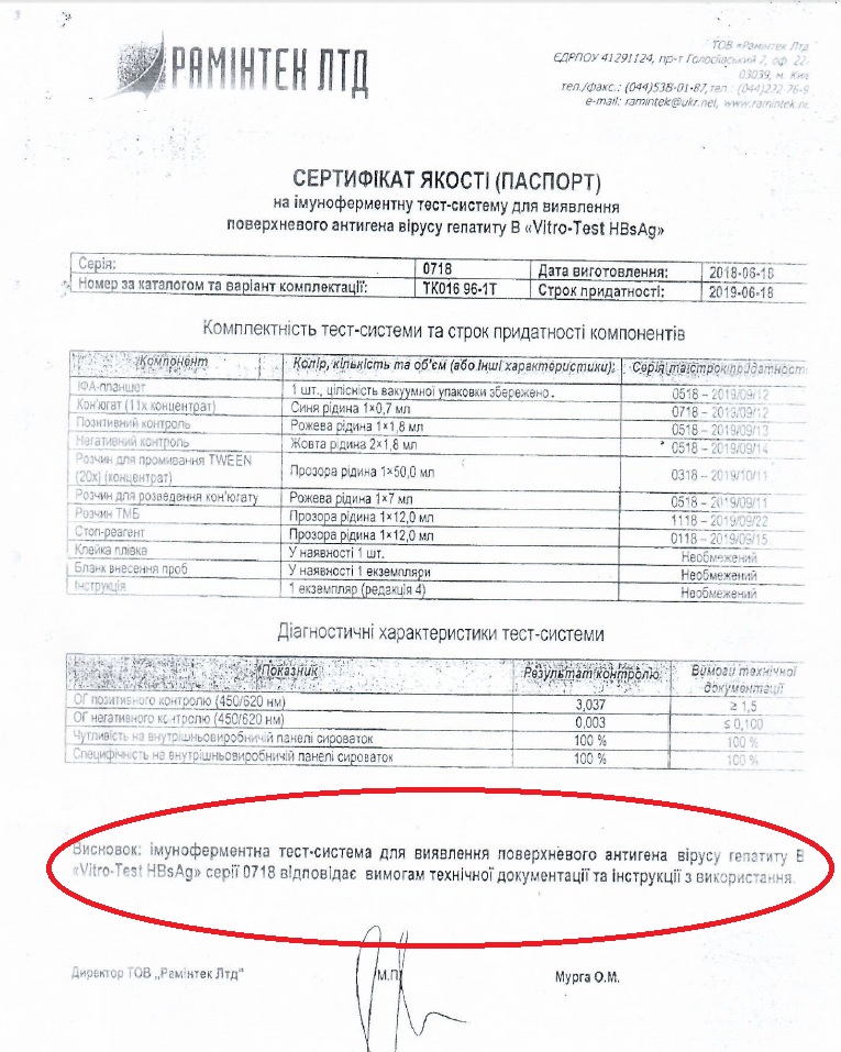 А на упаковках своих тест-систем «Раминтек ЛТД» продолжает указывать, что ее продукция «Vitro-Test» обладает сертификатами госпредприятия Минздрава — «Государственный медицинский центр сертификации», и даже использует его маркировку — UA.TR.067. Но казус состоит в том, что в марте 2018 года Нацагентство по вопросам аккредитации (НААУ) отменило аттестат про аккредитацию ГП ГМЦС МОЗ за множественные нарушения, а Минэкономразвития в апреле аннулировало решение о назначении этого предприятия органом по оценке соответствия продукции требованиям технических регламентов. С этого момента ни один производитель не имел права маркировать свою продукцию UA.TR.067. Однако, «Раминтек Лтд» сознательно идет на нарушение, и продолжает незаконно производить наборы для диагностики опасных инфекций, ставя на упаковке реквизиты неуполномоченного органа с аннулированной аттестацией. Проще говоря, это означает, что сертификатов соответствия у продукции «Vitro-Test» нет.