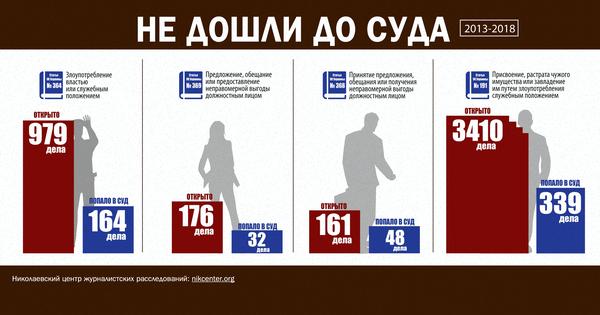 Из-за отказа полиции в предоставлении информации о количестве завершенных уголовных производств в отношении коррупционеров нам пришлось искать эти данные самостоятельно. Для этого мы выбрали все статьи из уголовного кодекса Украины, связанные с коррупционными правонарушениями, и посчитали, сколько производств по каждой из них рассматривалось в николаевских судах за последние пять лет.