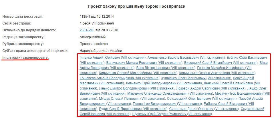 У законопроекта №1135-1 – 31 субъект законодательной инициативы, то есть 31 депутат из разных фракций Верховной Рады. Документ лежит в парламенте еще с 2014 года, по сути – это наработанная версия предыдущего варианта №1135. Авторы законопроекта объясняют, что суть документа в том, чтобы предоставить законопослушному человеку право на самозащиту. «Этот закон просто упорядочивает наше законодательство и дает возможность законопослушному гражданину защищать себя легально», - говорит нардеп Андрей Ильенко.