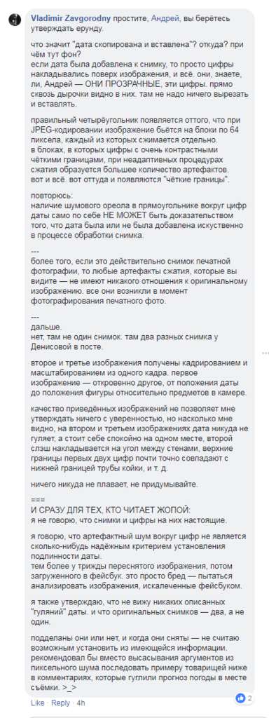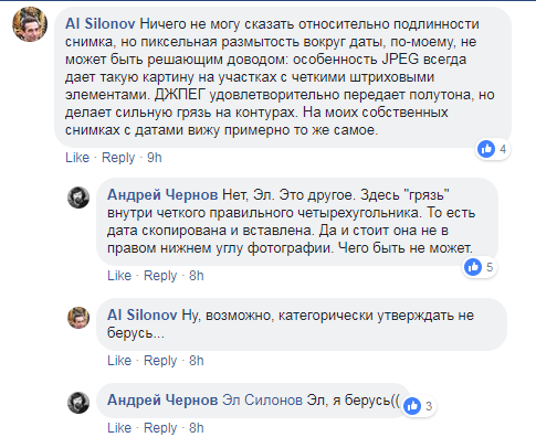 "Просто один снимок кадрирован и повторен как отдельный. Дата на фотографиях не имеет отношения к моменту съемки. Она вставлена в фотошопе. При увеличении на 300 % вокруг даты возникает четырехугольник с рябой поверхностью внутри него. Его нижняя часть заглажена, но верхняя и левая боковые грани прочерчены четко, как по линейке скальпелем. Так бывает только при вставке копии, выделенной с помощью рамки. При десятикратном увеличении становится очевидным, что не совпадает размер пикселей фона и вставки (на вставке они и создают рябь)", - аргументирует свои слова Чернов.