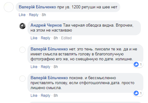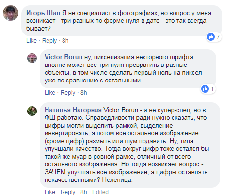 В комментариях к его посту пользователи отметили, что фото могут и не быть подделкой, поскольку из-за особенности изображений в формате JPEG могут возникать подобные эффекты с проставкой даты, а "приклеенная" голова на самом деле эффект от тени.
