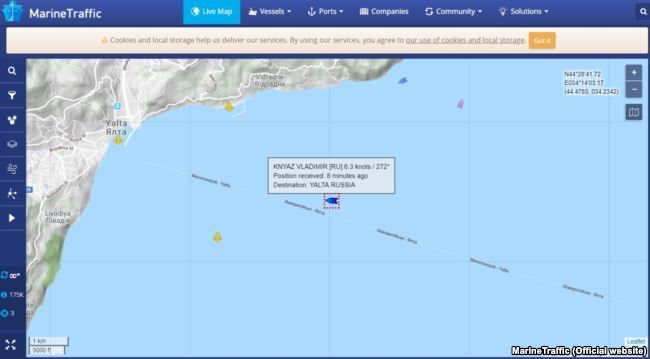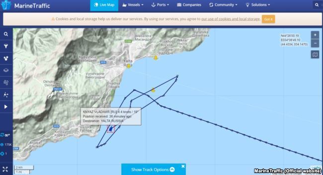 Проблемную траекторию движения "Князя Владимира" зафиксировала международная база передвижения судов Marine Traffic. Из нее видно, что между 17 и 18 часами 9 августа судно перемещалось из Гаспры в Ореанду. Затем его заметили у Никиты в направлении Аю-Дага. Впоследствии "Князь Владимир" развернулся и еще некоторое время кружил по акватории южного берега, прицеливаясь к ялтинскому порту.