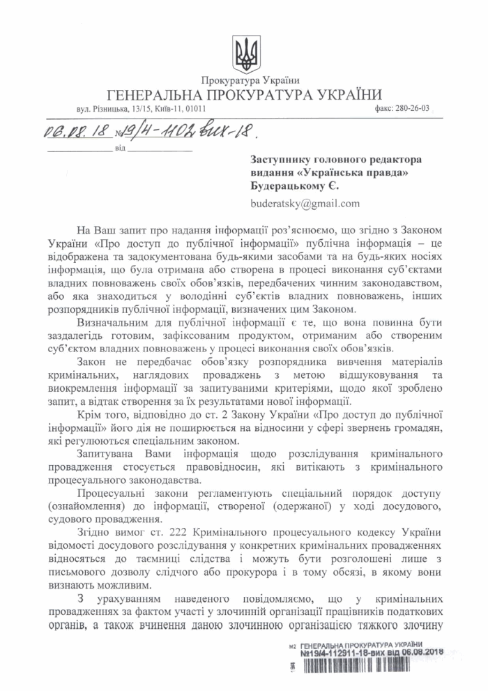 Наприкінці липня "Українська правда" надіслала запит до Генпрокуратури, у якому попросила надати адреси суду, де може відбутися розгляд справи щодо "податківців Клименка". Однак у Генпрокуратурі не відповіли.