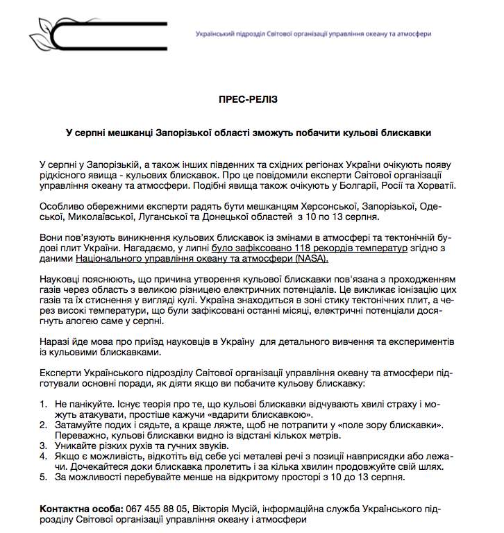 Відсутність коментаря експерта у прес-релізі — натяк на необхідність шукати його самостійно. Наприкінці релізу, як і годиться, було вказано контактну особу — Вікторію Мусій, представницю інформаційної служби Українського підрозділу Всесвітньої організації управління океану та атмосфери.