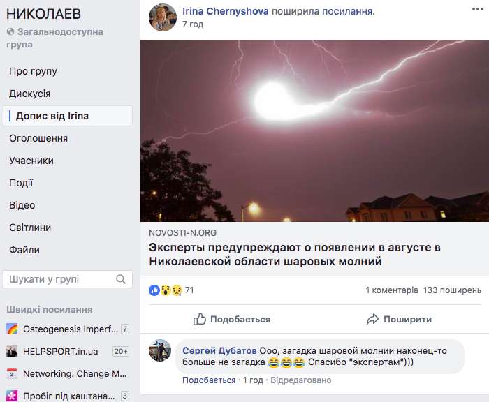 Вже о шостій вечора 1 серпня миколаївський журналіст Андрій Прокопенко написав на своїй сторінці у Фейсбуку, що інформація про кульові блискавки є фейком, який поширюється з невідомою метою.