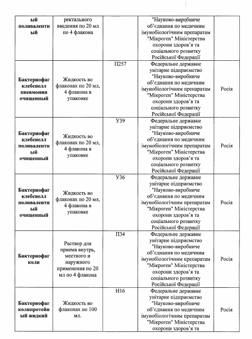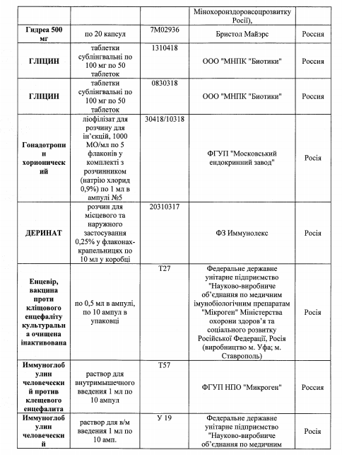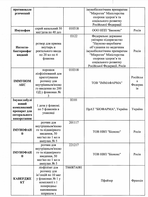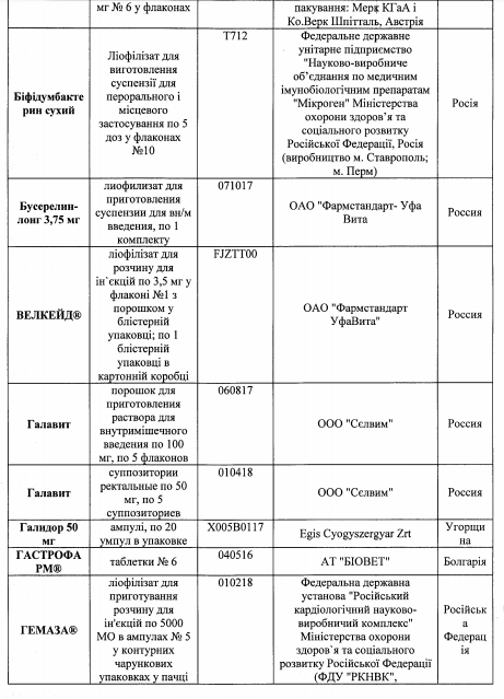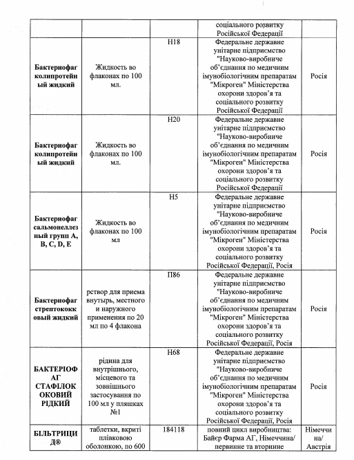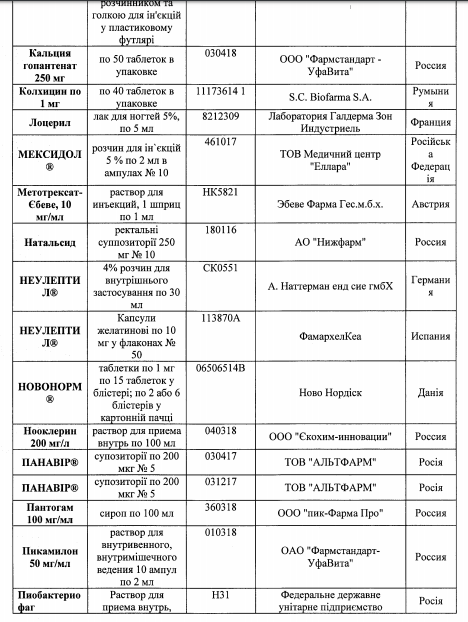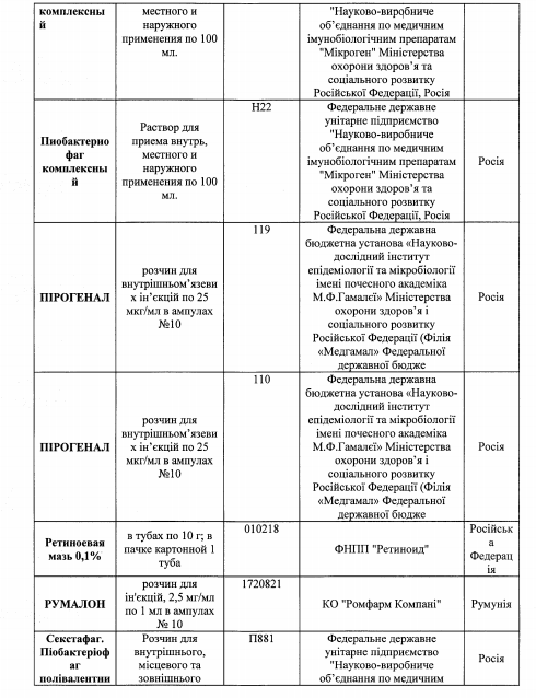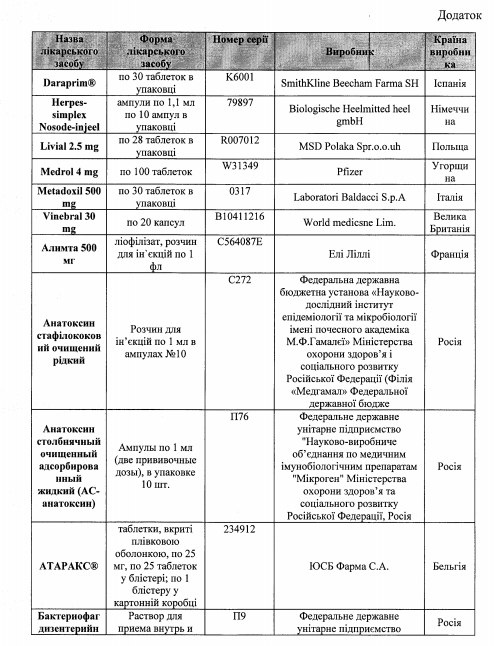 Также среди перечня имеющиеся лекарства украинского, немецкого, польского, венгерского, болгарского, бельгийского, французского, румынского, датского, испанского, итальянского и австрийского производства.