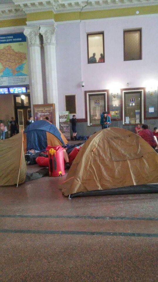 Во Львове после ночного протеста 19 августа, когда недовольные пассажиры разбили туристические палатки прямо в зале ожидания городского вокзала, руководство "Укрзализныци" пошло навстречу людям и заменило билеты.