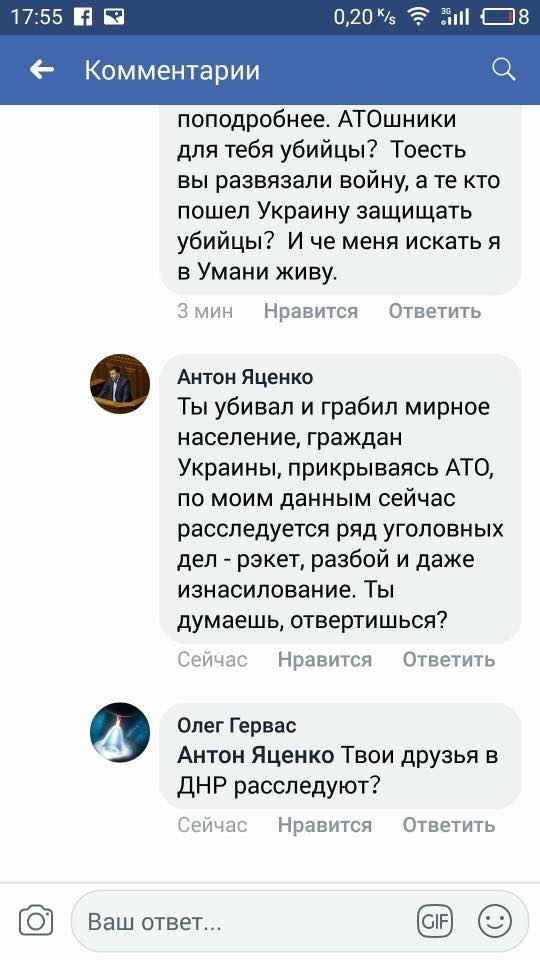 «Олег служил в 90-м бате, воевал в ДАПе, получил ранение, награжден орденом за мужество. Мы служили в одной роте. Олег очень достойный человек и воин! Все, что изверг своим ртом Яценко — чистейшая ложь.»