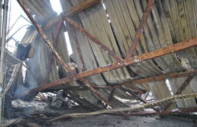 На видео видно, что от здания остались одни стены — большая часть крыши склада обвалилось. Утром остатки склада еще дымились.