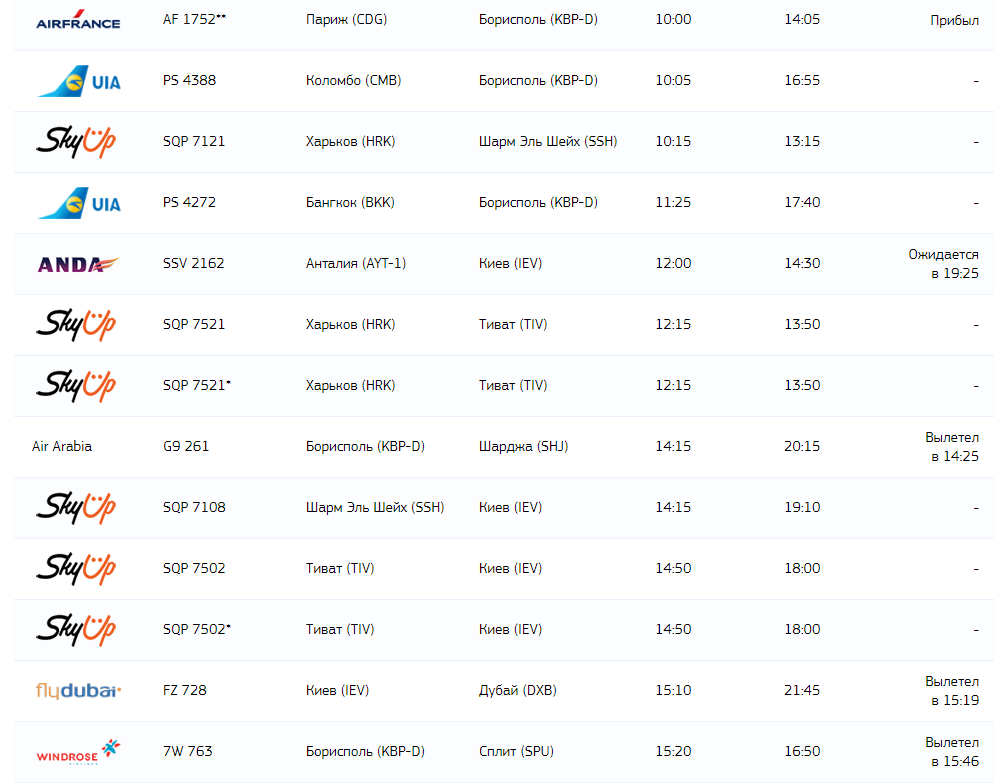 На сайте туристической компании указано, что рейс должен был вылететь сегодня в 12:00 и прибыть в Киев в 14:30. Статус этого рейса – "ожидается в 19:25".